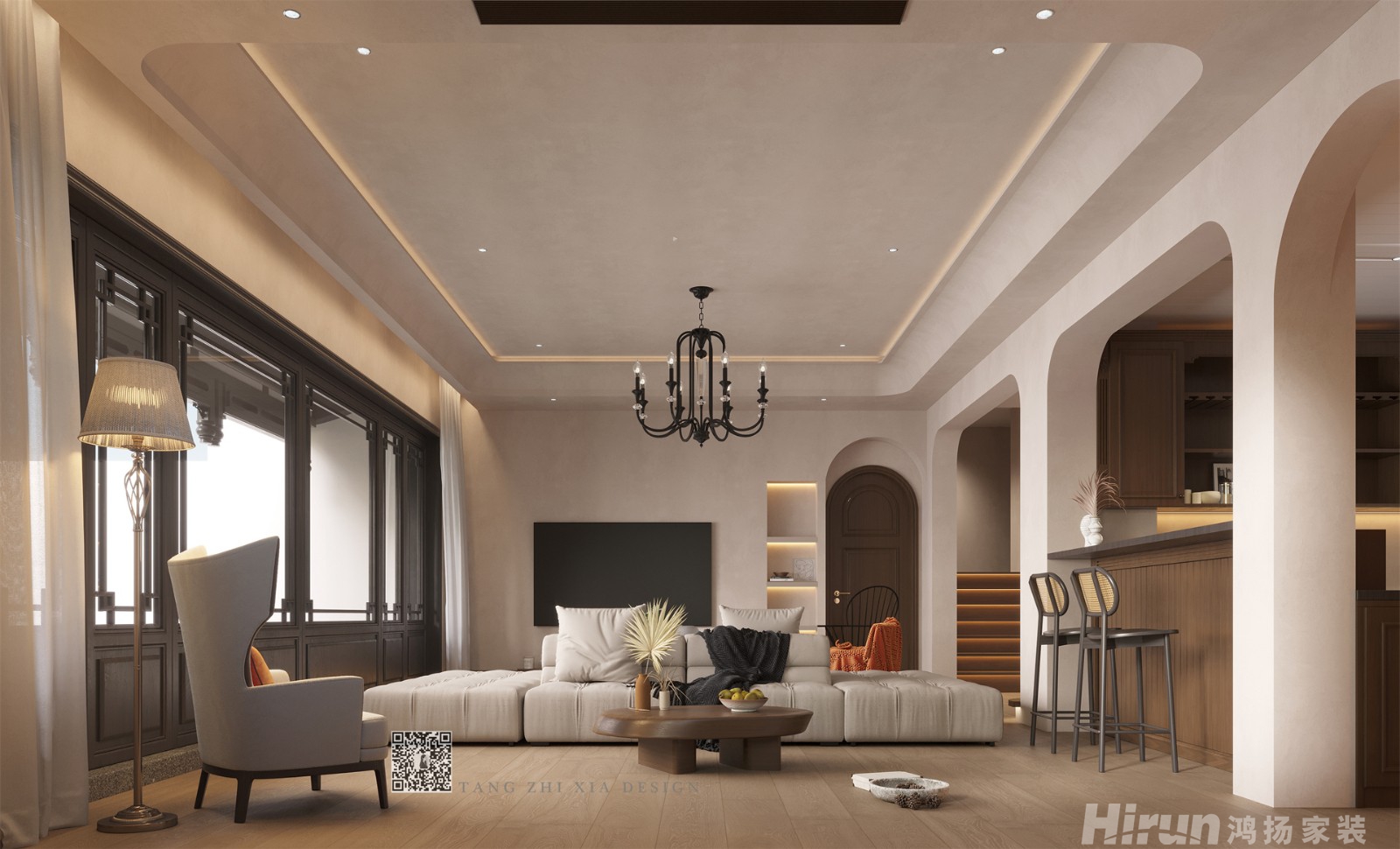 中式的外觀造型以及中式庭院是戶外的建筑體,室內(nèi)用古典的美式復(fù)古的元素做中西的結(jié)合混搭,讓整體室內(nèi)外不同,又不違和沖突。 室內(nèi)盡量簡化硬裝的裝飾性的造型,大體保持原建筑的挑高,運(yùn)用很多的拱券穹頂,室內(nèi)的頂面結(jié)構(gòu)讓空間一樣豐富有層次。