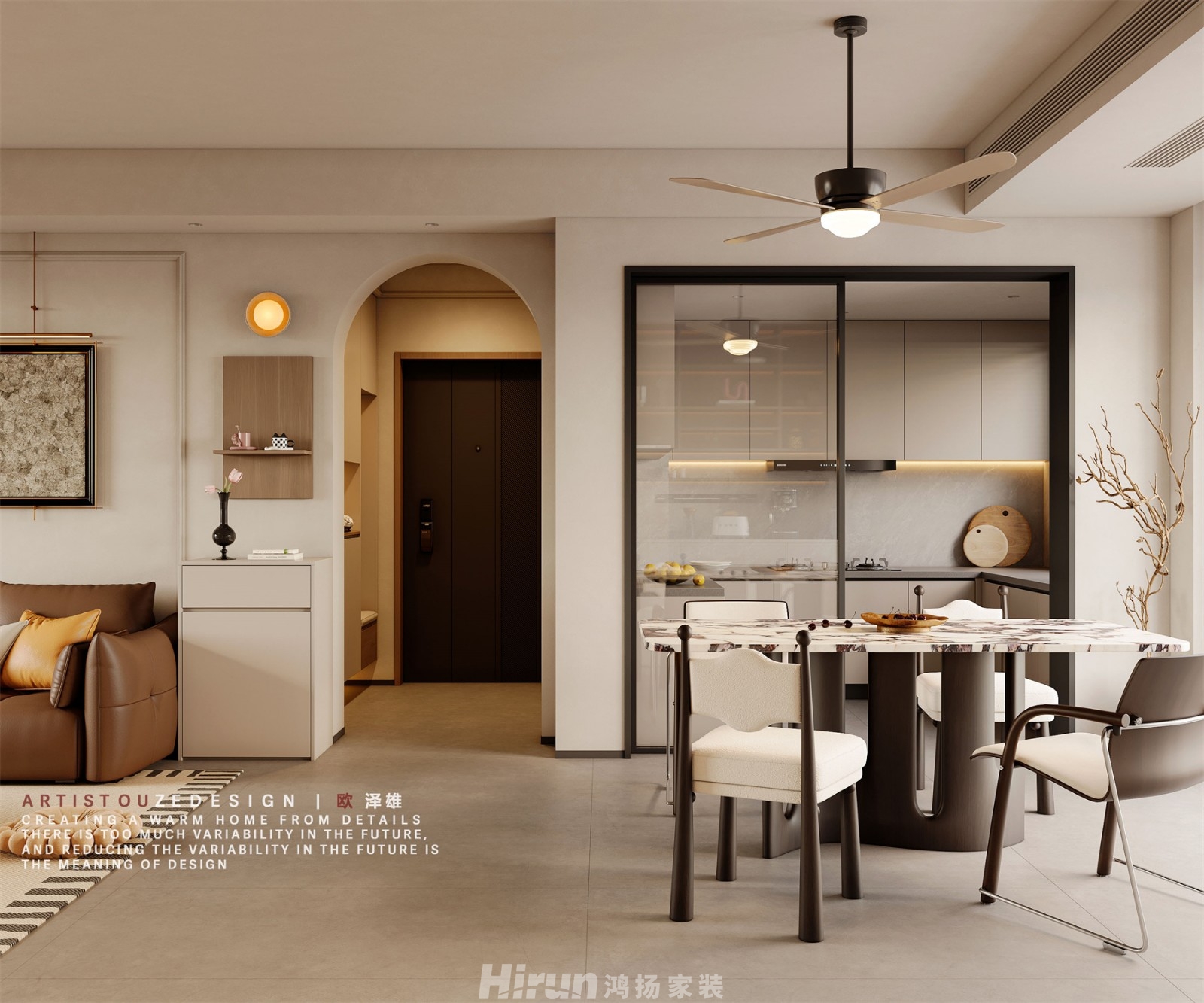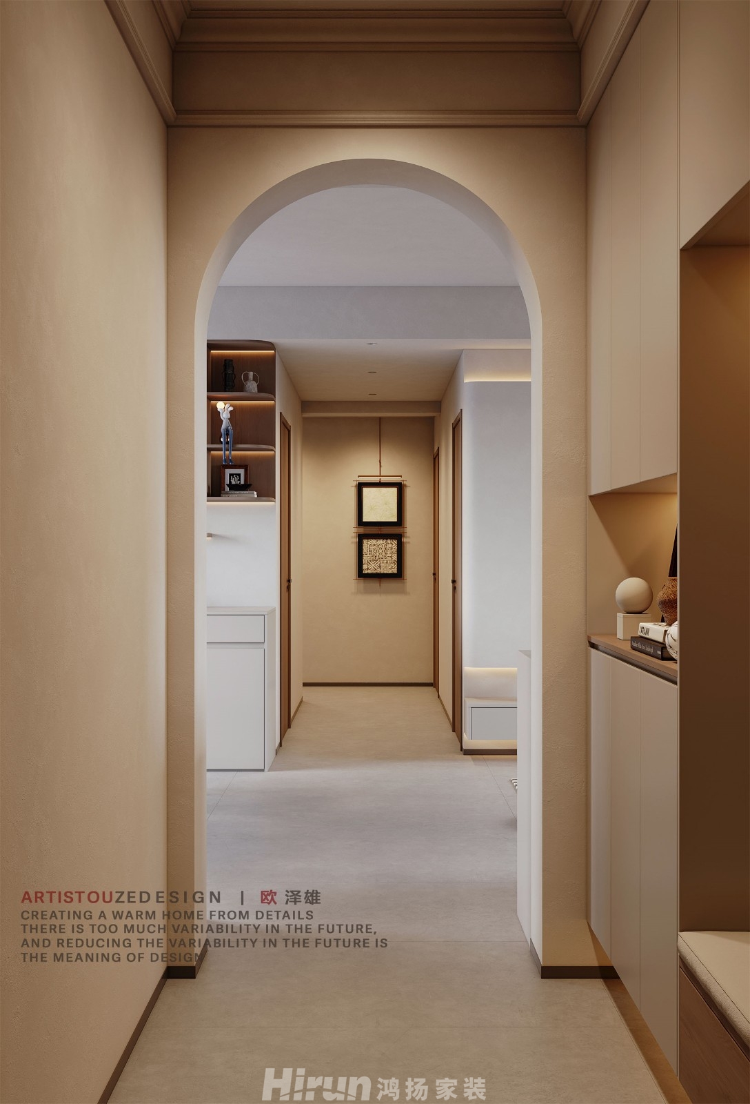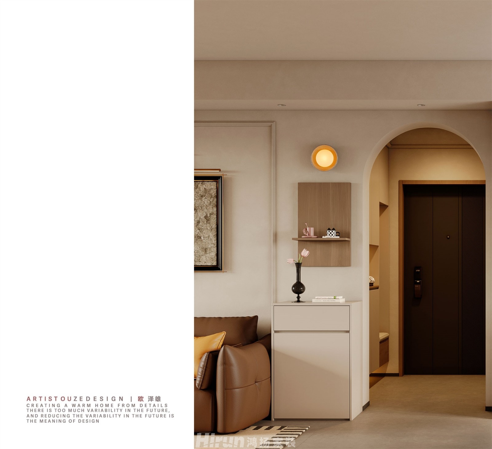 獨立的門廳,讓私密感更強,也滿足了小孩及長輩房換鞋凳的功能,弧形元素的運用使得空間和整體色系更舒適。