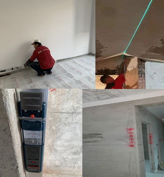 ①門洞、柜子邊緣進行找平處理,找平完成后垂直度和平整度≤3mm②原基層平整度≤10mm時,使用耐水膩子粉,用2米鋁合金靠尺(批刮工具)批、刮平整。平整度在10—20mm時,則用耐水膩子加珍珠巖進行找平處理。③膩子基層完成后,墻面平整度≤3mm/2m,頂面平整度≤3mm/2m,陰陽角順直。